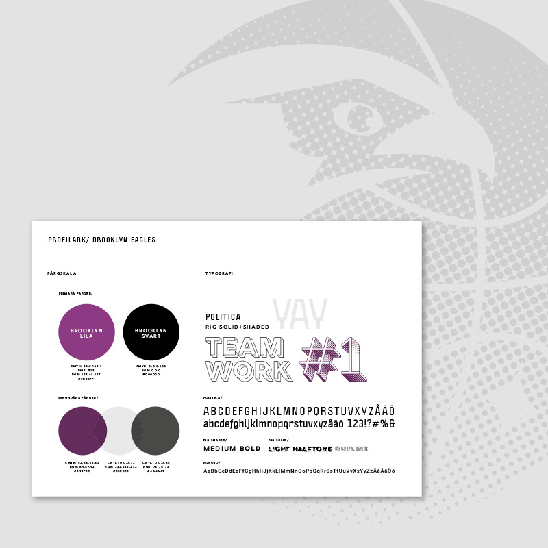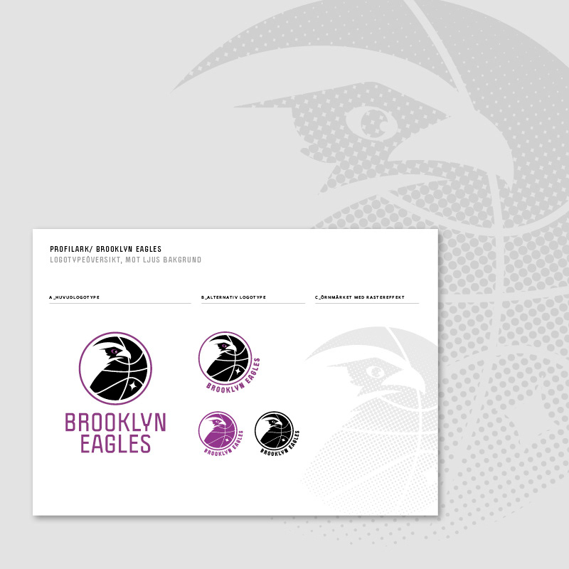 Med utgångspunkt från Brooklyns tidigare örnsymbol, en ny logotype och grafisk profil till vår lokala basketklubb Brooklyn Eagles. Även design av nya matchställ och träningskläder samt grafik till sociala medier.