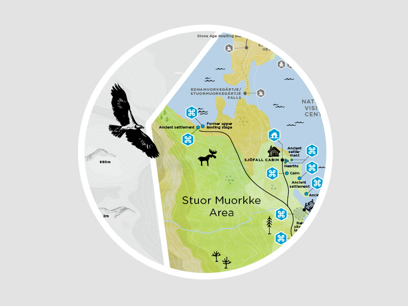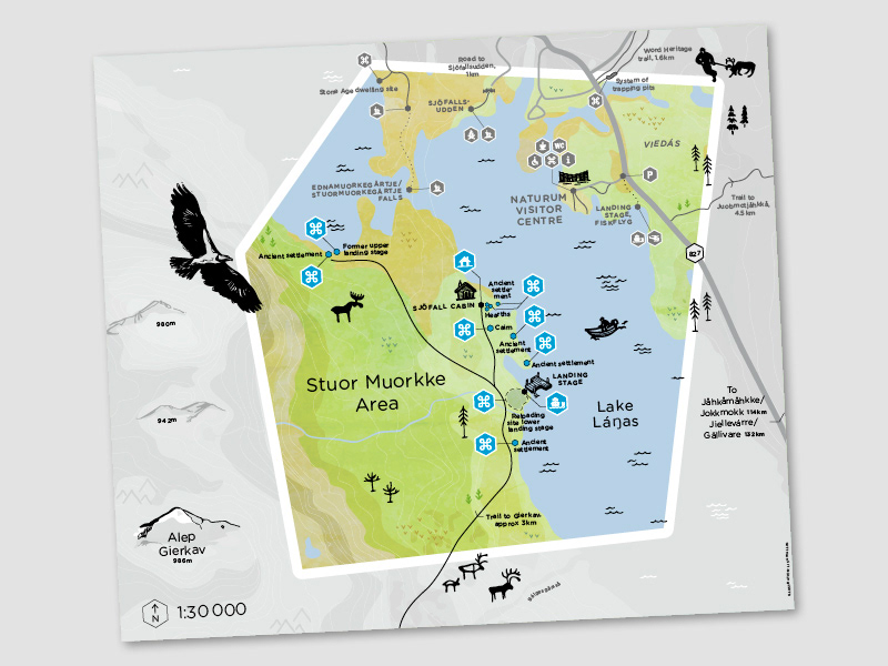 Illustrerad karta över Stuor Muorkke/Stora Sjöfallets Nationalpark.